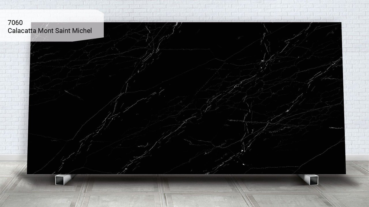 7060 Calacatta Mont Saint-Michel – Elitinė kolekcija Sodrus juodas paviršius su kontrastingomis baltomis venomis, poliruotas, suteikia interjerui modernumo ir prabangos. Puikiai tinka virtuvėms, vonios kambariams, sienų ar komercinių erdvių apdailai.